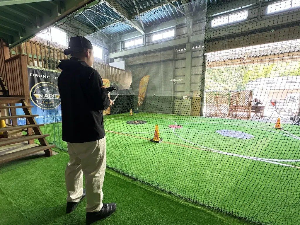 横浜市緑区のドローンコート Flight Zone 839の様子をご紹介しています。広い倉庫を改装して、人工芝や防護ネット、各種ユーティリティを設け、快適なドローンの練習が可能になっています。
